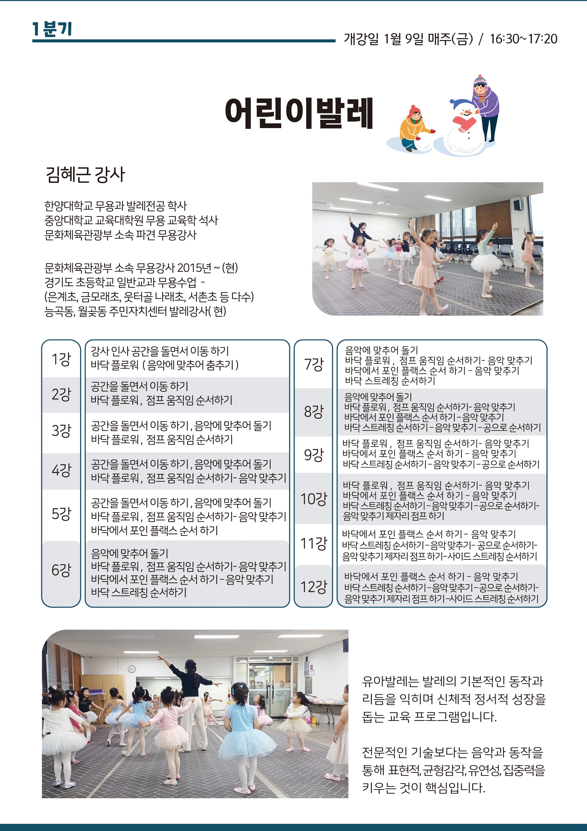▶개강일 : 1월 9일(금), 매주금 16:30-17:20 ▶준비물 : 발레복. 슈즈 [프로그램 접수시 유의사항] ※ 시흥시교육캠퍼스 '쏙'에서 자녀 본인 이름으로 가입하고 수강신청하면 다자녀 할인 적용이 안됩니다. (프로그램상 자녀 본인으로 할인이 불가하다고 합니다. 보호자가 대신 할인적용) ※ 부모님이 대신 가입하고 신청하셔야 프로그램상 다자녀 할인이 가능합니다. ※ 다자녀 할인대상이 아니면, 자녀 이름으로 가입/신청 가능합니다. ※ 선택정보에 반드시 자녀의 이름과 생년월일을 남겨주셔야 합니다. 출석부에 자녀의 이름이 올라갑니다. ▶강좌소개 유아발레는 발레의 기본적인 동작과 리듬을 익히며 신체적 정서적 성장을 돕는 교육 프로 그램입니다. ▶강좌목표 전문적인 기술보다는 음악과 동작을 통해 표현적, 균형감각, 유연성, 집중력을 키우는 것이 핵심입니다. ◎ 어린이 발레의 장점 - 신체 발달 : 유연성, 균형감각, 근력 향상 - 자세 교정 : 올바른 자세와 걸음걸이 형성 - 집중력 향상 : 동작을 기억하고 따라 하면서 집중력과 기억력 발달 - 자신감 향상 : 무대에서의 발표 기회나 성취감을 통해 자존감 향상 - 사회성 발달 : 친구들과 함께 수업을 들으며 협동심과 예절을 배움