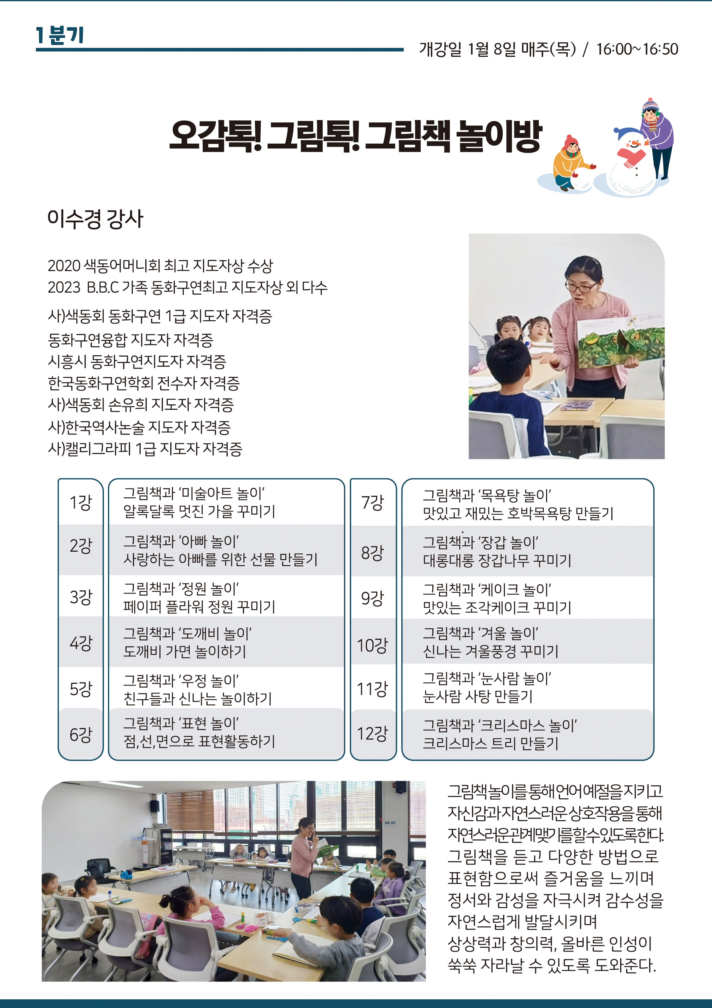 ▶개강일 : 1월 8일(목), 매주 목요일 16:00-16:50 ▶재료비별도 [프로그램 접수시 유의사항] ※ 시흥시교육캠퍼스 '쏙'에서 자녀 본인 이름으로 가입하고 수강신청하면 다자녀 할인 적용이 안됩니다. (프로그램상 자녀(유아) 본인으로 할인이 불가하다고 합니다. 보호자가 대신 할인적용) ※ 부모님이 대신 가입하고 신청하셔야 프로그램상 다자녀 할인이 가능합니다. ※ 다자녀 할인대상이 아니면, 유아(자녀) 이름으로 가입/신청 가능합니다. ※ 선택정보에 반드시 자녀의 이름과 생년월일을 남겨주셔야 합니다. 출석부에 자녀의 이름이 올라갑니다. 과목소개 다양한 그림책 놀이를 통해 유아기에 꼭 필요한 오감발달을 키우고 놀이를 통해 친구 맺기를 즐겁고 자연스럽게 배웁니다. 의성어, 의태어를 사용하여 실감나고 재미있게 그림책을 들려줍니다. 다양한 책놀이와 표현활동으로 정서와 언어 기능을 발달단계에 맞춰 성장하게 합니다. 강의목적 그림책 놀이를 통해 마음껏 놀고 배우며 성장 할 수 있도록 한다. 그림책을 듣고 다양한 방법으로 표현함으로써 오감발달과 소근육, 대근육을 자연스럽게 발달시키며 정서적 지능과 언어적 지능을 쑥쑥 자라날 수 있도록 도와준다.