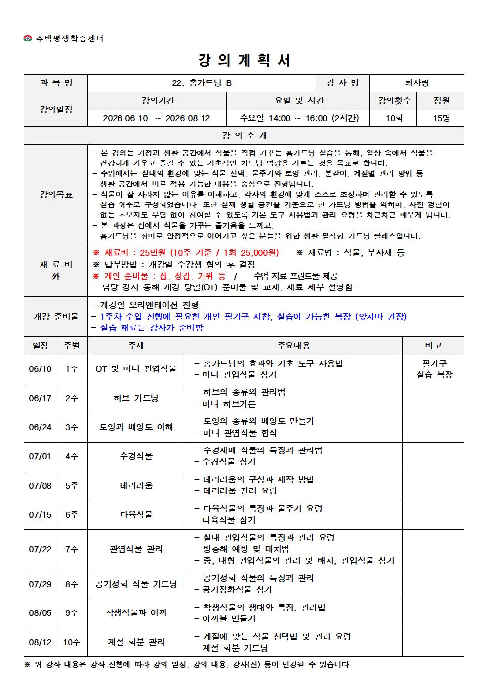 [수택평생학습센터] [수택평생학습센터]2026년 상반기 정규강좌 22. 홈가드닝 B🚩 프로그램 일정 및 강의 계획서 사전 확인 필수!