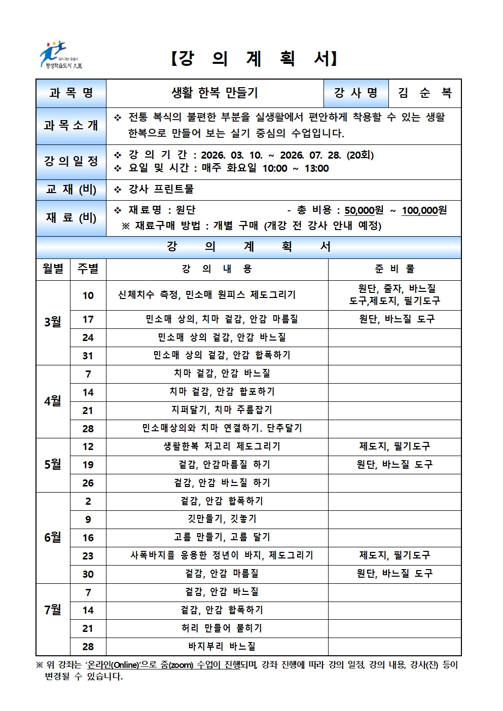 [구리시평생학습관] [구리시평생학습관]2026년 상반기 정규강좌 19. (외부)생활한복 만들기프로그램 별 일정 및 강의 계획서 사전 확인 필수!