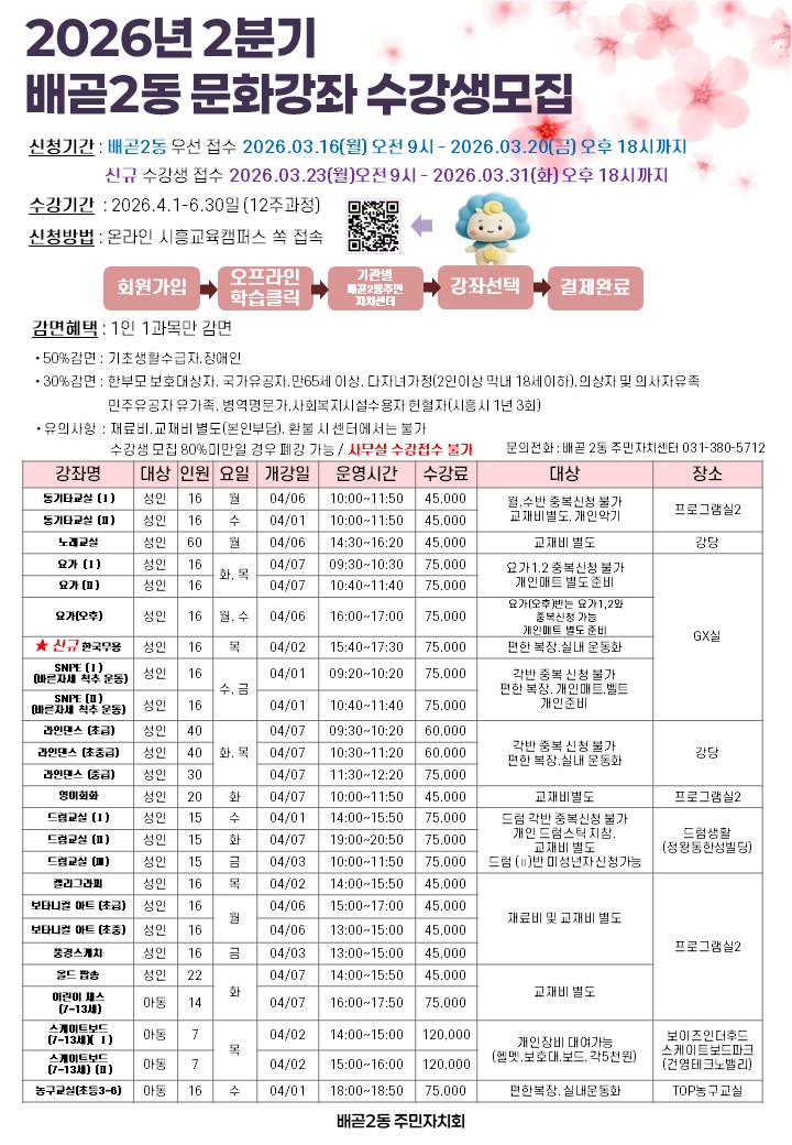 | 수강관련 문의처 | 배곧2동주민자치회 / 031-380-5712 / qorhe2ehd@naver.com |