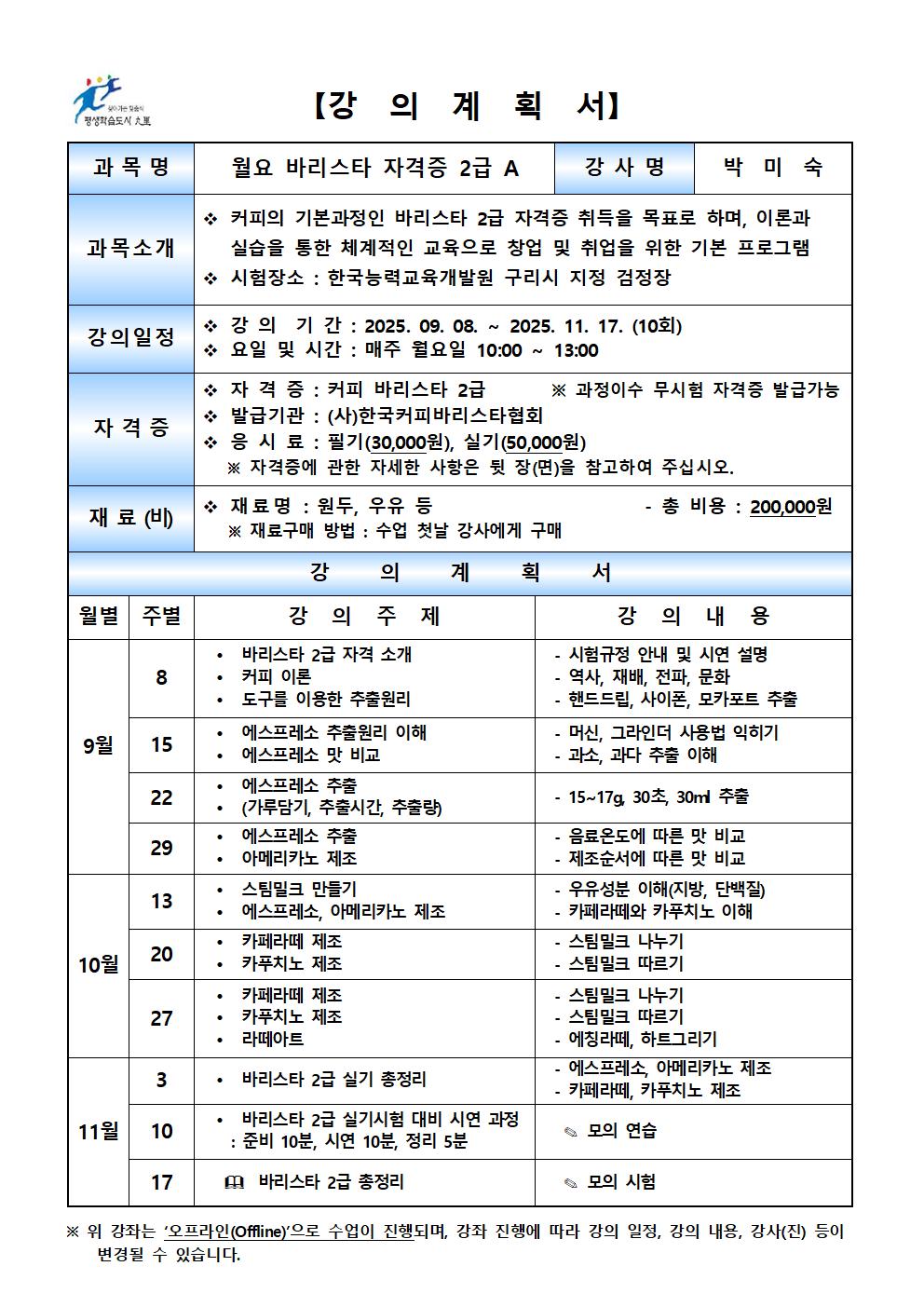 [구리시평생학습관] [구리시평생학습관]2025년 하반기 정규강좌 03.(외부)월요 바리스타 자격증 2급 A프로그램 별 일정 및 강의 계획서 사전 확인 필수!