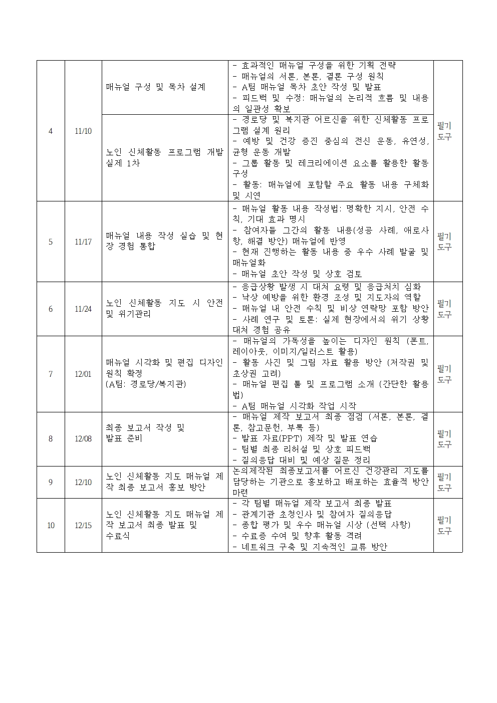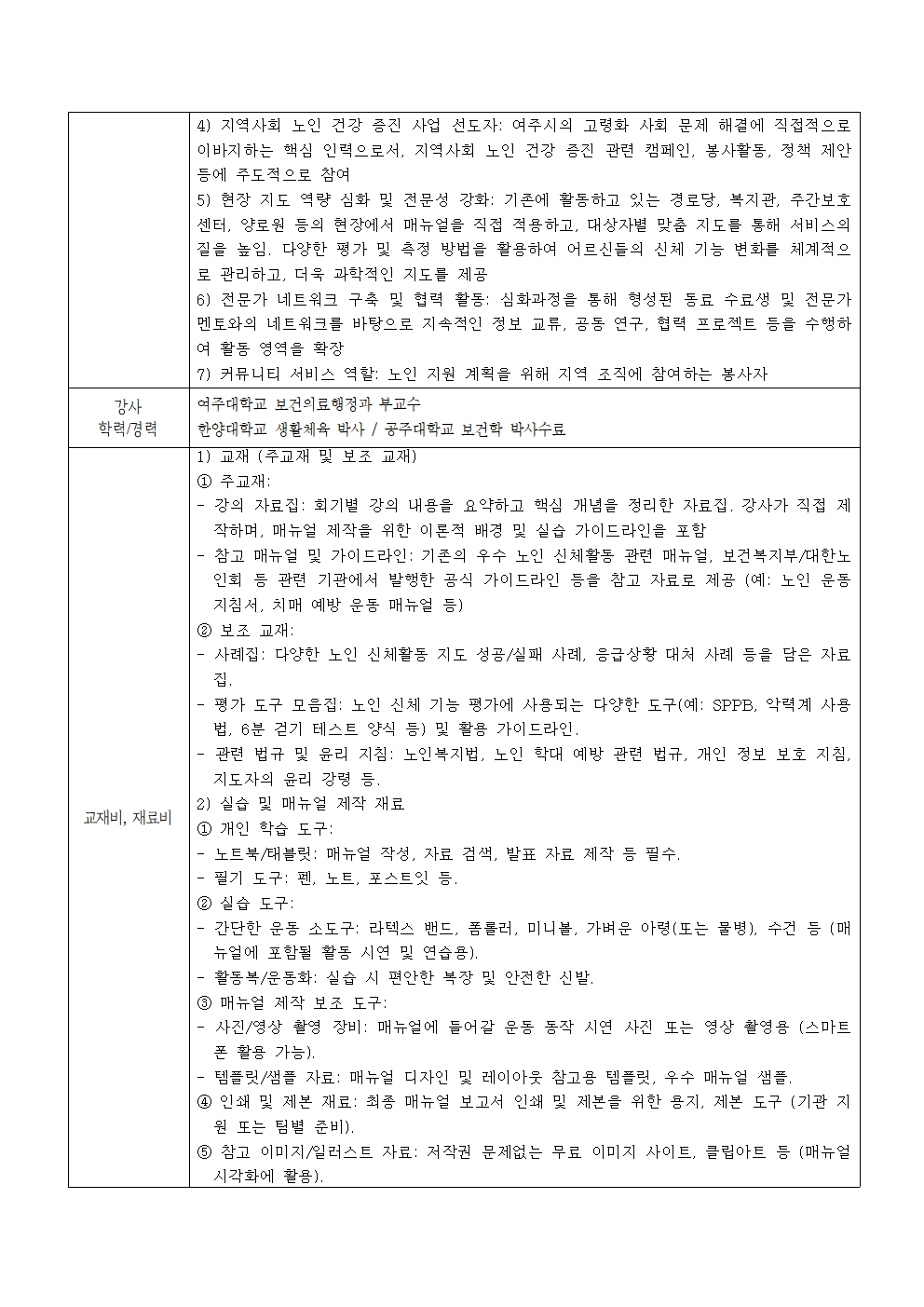 ○ 2024-2025년 여주시 5060역량강화 프로그램 수료하고 현재 노인운동지도자 및 노인돌봄지도자로 활동하고 있는 전문가들을 대상으로 매뉴얼 제작을 통해 실질적인 현장 역량을 강화하고 지역사회 건강증진에 기여하고자 함.