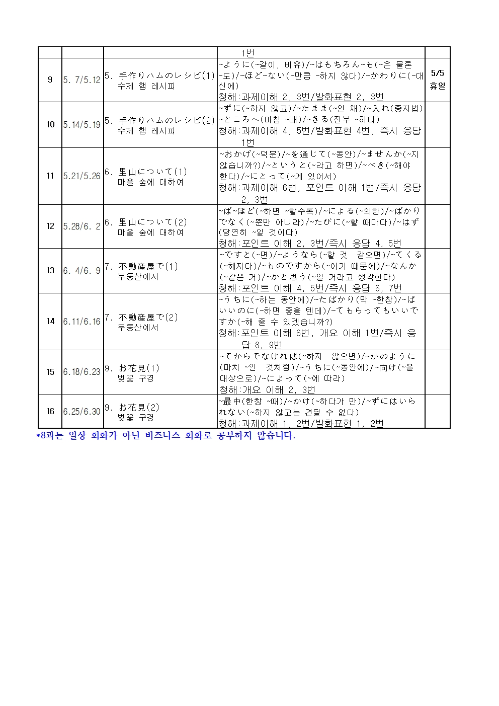 일본어 회화 중급은 초급 문법을 공부하신 분이나 심화 학습을 기대하는 분들을 대상으로 하며, ZOOM을 이용한 실시간 화상수업으로 진행합니다. 여러 문형과 문법 사항을 공부하고 연습문제를 푼 다음, 대화문, 수필, 레시피, 광고, 안내문 등의 본문을 해석하며 학습 내용을 한 번 더 확인합니다.