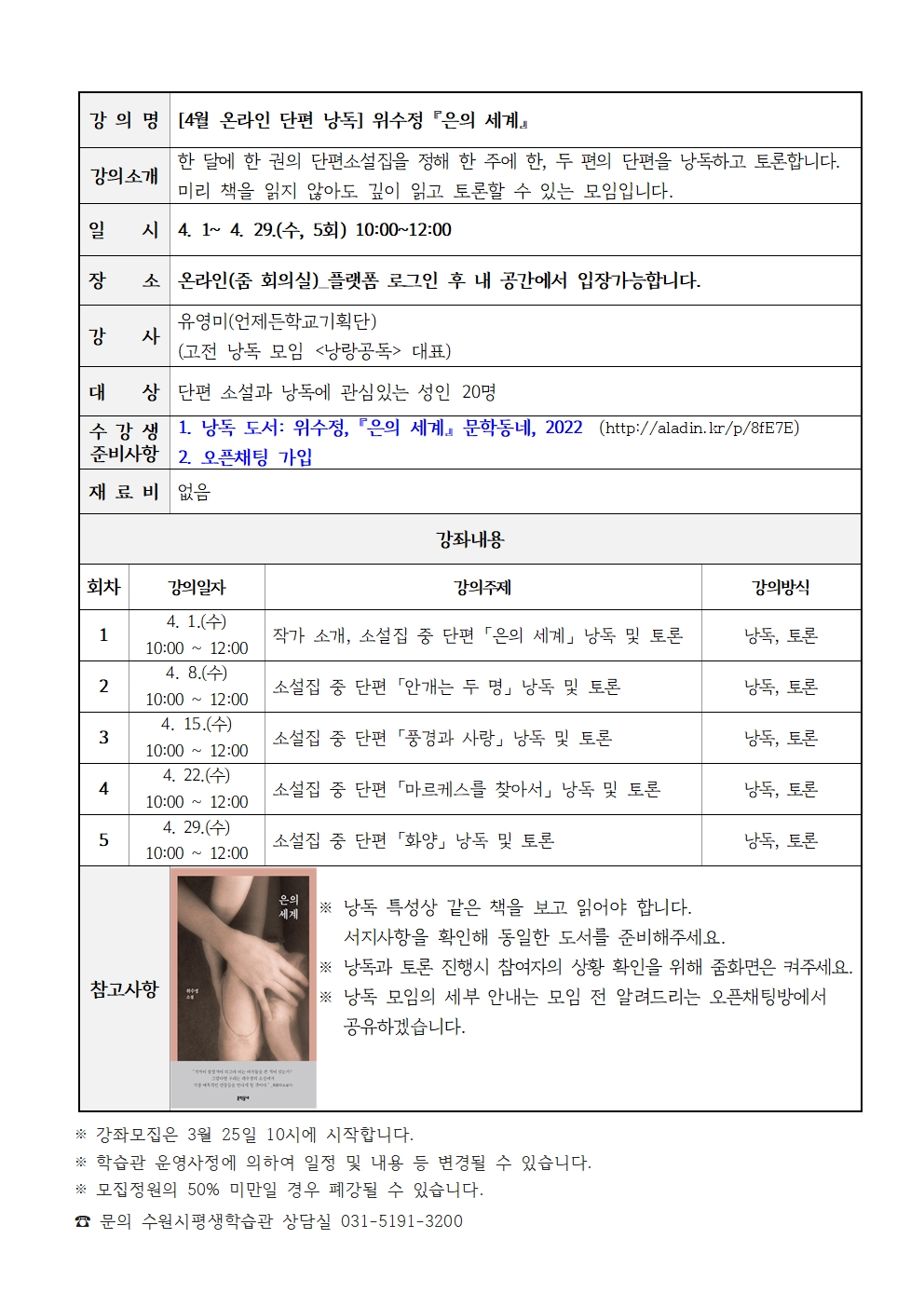 평생학습관 강좌 평생학습관 2026년 2분기 강좌 [언제든학교][4월 온라인 단편 낭독]위수정, 「은의 세계」※ 강좌모집은 3월 25일 10시에 시작합니다.